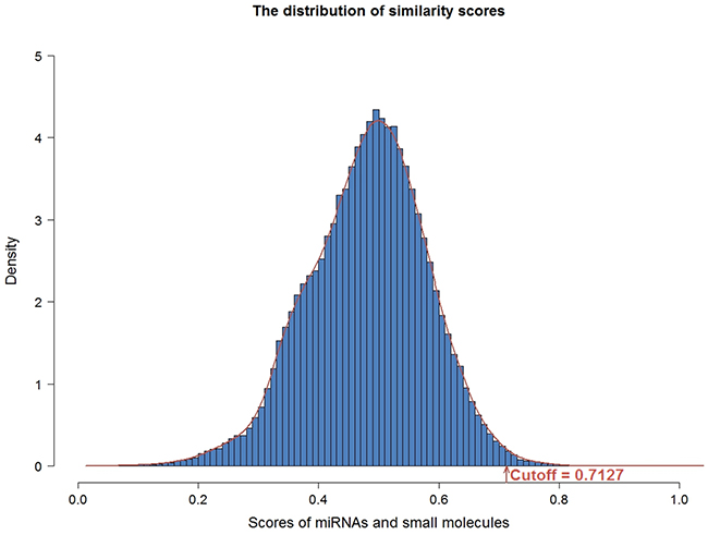 In order to construct the functional similarity network between small molecules and miRNAs, we first collected gene expression profiles under perturbation of 88 miRNAs and treatment of 1309 bioactive small molecules. Second, we identified differentially expressed genes for small molecules and miRNAs. Then, we calculated functional similarity based on Gene Ontology (GO) enrichment analysis of the differentially expressed genes for each pair of small molecule and miRNA. As a result, we obtained the functional annotations of 1293 small molecules and 70 miRNAs (details in materials and methods). Here, similarity scores followed an approximate normal distribution with mean and standard deviation equaling to 0.4882 and 0.0965, respectively (Figure 2). The threshold of similarity score was determined by the value of the normal distribution at the significance level of 0.01, which was 0.7127. Finally, we constructed the small molecule-miRNA functional similarity network (538 associations) under the threshold of similarity score (0.7127), including 111 small molecules and 20 miRNAs (Figure 3, details in Supplementary Table S1). Especially, all 20 miRNAs in our predicted associations have been proved to play important roles in cancer, which were supported by previous studies. Taking miR-21 as an example, miR-21 is an oncogenic miRNA which is overexpressed in several tumors including breast cancer [19]. When suppressing the expression of miR-21 in breast cancer cells, cancer cells significantly reduced invasion and metastasis [20]. Its associated small molecule Tretinoin (the similarity score is 0.745) is also known as all-trans-retinoic acid, which is an important regulator of cell reproduction, proliferation and differentiation. In addition, Tretinoin is usually used to treat acute promyelocytic leukemia [21] and has been demonstrated to have potential therapeutic action in breast cancer [22]. Therefore, miR-21 may be a potential target for Tretinoin in the treatment of breast cancer.