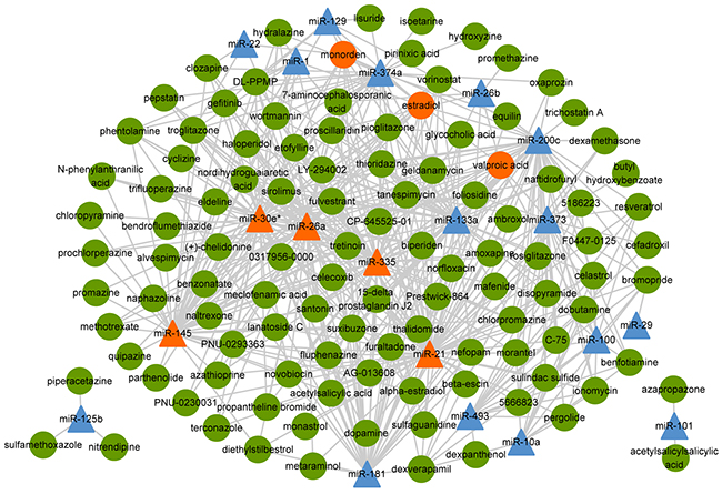 Figure 3: The small molecule-miRNA functional similarity network. The triangles and circles represent miRNAs and small molecules, respectively. The orange triangles and circles are hub nodes of miRNAs (degree greater than 50) and small molecules (degree greater than 10), respectively.