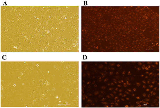 Figure 3: siRNA Representative fluorescence images of IPEC-J2 cells 48 h post-transfection with the transfection control (Cy3)-siRNA. IPEC-J2 cells under normal light after transfection with the control (Cy3)-siRNA (100× A. and 200× C.). Corresponding fluorescence photos of IPEC-J2 cells after transfection with the control (Cy3)-siRNA (100× B. and 200× D.). Scale bars: 100 μm. Representative results of the three independent experiments are shown.
