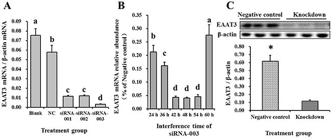Figure 4: Screening for the optimal EAAT3 siRNA and interference time in IPEC-J2 cells. The effects of three siRNAs on EAAT3 mRNA abundance were measured by real-time PCR 48 h post-transfection A. Blank: blank control group; NC: negative control group; siRNA-001: EAAT3-siRNA-001 group; siRNA-002: EAAT3-siRNA-002 group; siRNA-003: EAAT3-siRNA-003 group. The effects of siRNA-003 transfection time on EAAT3 mRNA abundance were measured by real-time PCR B. Data are expressed as means ± SEM (n=6). Different letters indicate significant differences (P<0.05). siRNA-003 treatment reduced EAAT3 protein levels as compared to the Negative controls C. Negative control: negative control group; Knockdown: EAAT3-siRNA-003 group. Representative results of three independent experiments are shown. Data are expressed as means ± SEM (n=3); *P<0.05.