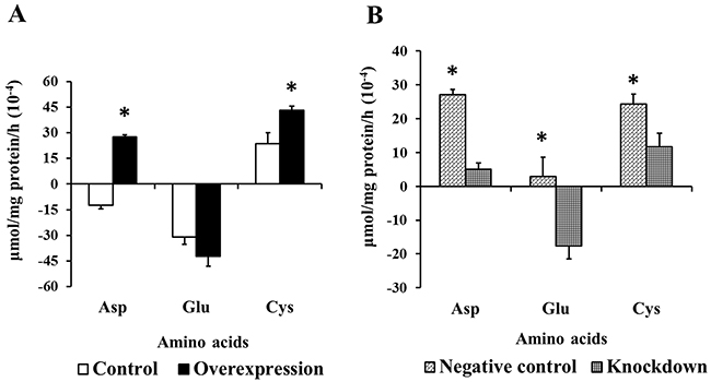 Figure 5: Effects of EAAT3 overexpression A. and knockdown B. on amino acid transport in IPEC-J2 cells. Control: control group; Overexpression: EAAT3 overexpression group. Negative control: negative control group; Knockdown: EAAT3-siRNA-003 group. Glu: glutamate; Asp: aspartate; Cys: cystine. Representative results of three independent experiments are shown. Data are expressed as means ± SEM (n=6); *P<0.05.