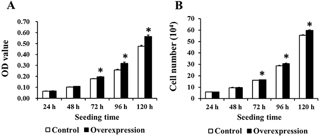 Control and Overexpression cells were cultured in 6-well plates at 1×105 cells/mL in growth medium. Briefly, cells were detached with 0.25% trypsin (Sigma, St Louis, MO, USA) for 5–8 min at 37°C after washing twice with PBS and then blocked with an equal volume of growth medium. The number of viable cells was determined using a hemocytometer under an Inversion Microscope System (Nikon, Japan). Three independent experiments were conducted.