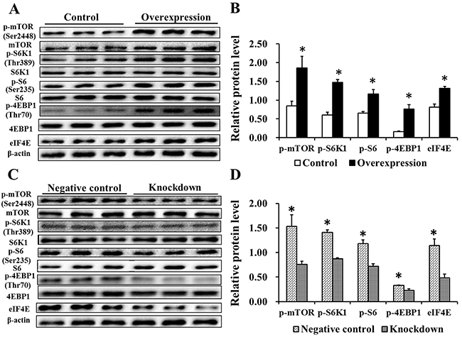 Figure 7: Effects of EAAT3 overexpression A–B. and knockdown C–D. on mTOR pathway related proteins in IPEC-J2 cells. Control: control group; Overexpression: EAAT3 overexpression group. Negative control: negative control group; Knockdown: EAAT3-siRNA-003 group. Representative results of three independent experiments are shown. Data are expressed as means ± SEM (n=3); *P<0.05.