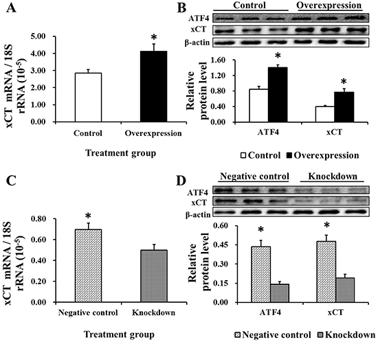 Figure 8: xCT mRNA abundance (n=6) and protein level (n=3) and ATF4 protein level (n=3) after EAAT3 overexpression A–B. or knockdown C–D. as measured by real-time PCR and western blotting. Control: control group; Overexpression: EAAT3 overexpression group. Negative control: negative control group; Knockdown: EAAT3-siRNA-003 group. ATF4: activating transcription factor 4; xCT: cystine/glutamate antiporter. Representative results of three independent experiments are shown. Data are expressed as means ± SEM; *P<0.05.