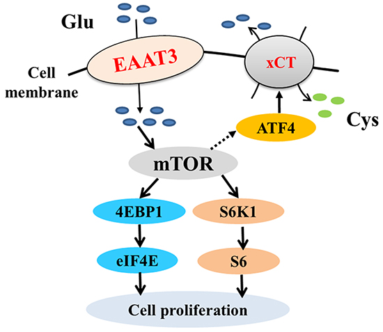 In summary, our data demonstrate that EAAT3 activates the mTOR pathway to promote amino acid transport and cell proliferation. Moreover, ATF4 and xCT expression may be enhanced during EAAT3-induced mTOR pathway activation to transport excess Glu into the extracellular environment.