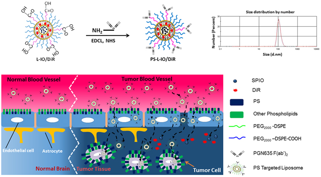 Figure 1: Illustrations of nanoformulation of PS-L-IO/DiR and its mode of action of the PS-targeted delivery for enhanced glioma-selective imaging. A size distribution curve obtained by dynamic light scattering (DLS) analysis indicates an average hydrodynamic size of 110 nm.