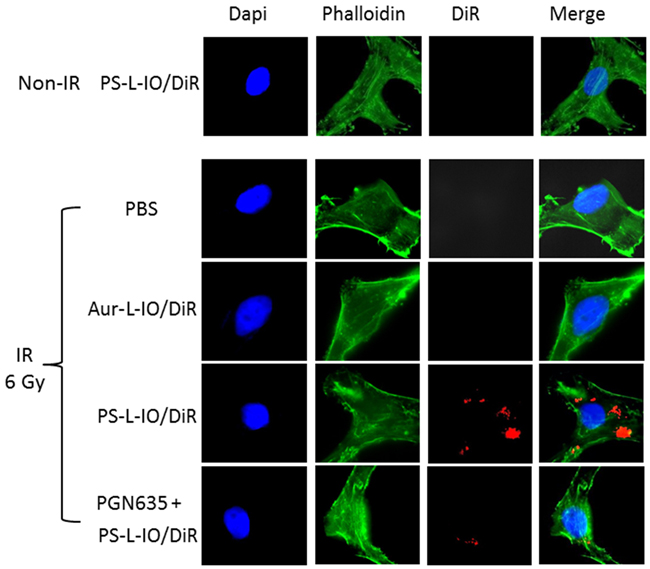Figure 2: In vitro PS-targeting specificity of PS-L-IO/DiR. Glioma U87MG-luc cells were pre-treated with/without a 6 Gy irradiation 24 h before they were incubated with PBS, Aur-L-IO/DiR or PS-L-IO/DiR for 1 h. Immunocytofluorescence images (40 X) of nuclei (Dapi) and cytoskeleton (green) staining were merged with DiR (red) signals of the same field, showing massive intracellular DiR signals only observed in the cells treated with PS-L-IO/DiR. Prior treatment with the full length PGN635 blocked majority of DiR signals.