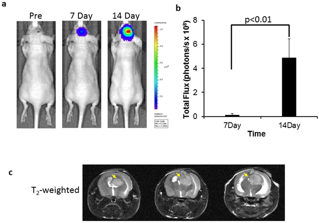 Figure 3: BLI and MRI monitoring of intracranial growth of U87 glioma. a. Longitudinal BLI showed that light intensity in the mouse brain increased significantly over time, which was quantified in b. (p < 0.01). c. For the same mouse, T2-w MRI on day 14 revealed the hyperintense intracranial tumor on three consecutive slices (arrows). Hydrocephalus was also evident due to the tumor mass effect.