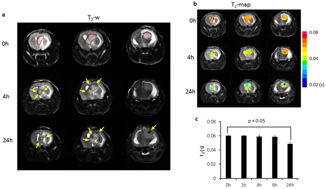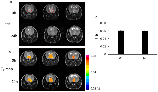 Figure 5: In vivo MRI of the control probe, Aur-L-IO/DiR. a. To establish the glioma-targeting specificity of the PS-L-IO/DiR probe, the control probe Aur-L-IO/DiR (2.5 mg Fe/kg) was injected into a U87 glioma-bearing mouse. T2-weighted images of the mouse brain acquired before and 24 h post injection revealed no obvious signal change in the tumor region (outlined) at 24 h. T2 maps of the tumor b. and quantitative T2 data c. showed minimal change in T2 at 24 h (mean =60 ± 2) versus the baseline 0 h (61 ± 1 ms).