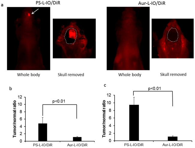 Figure 6: In vivo near infrared optical imaging of the PS-L-IO/DiR for specific glioma targeting. Immediately after MRI at 24 h, in vivo optical imaging was conducted. a. For the same mouse shown in Figure 4, 24 h post PS-L-IO/DiR, the whole body NIR optical imaging revealed a brighter signal from the right brain. The region of brain tumor became clearly delineated from normal brain (outlined) after removal of the skull. There was no detectable tumor signal in the Aur-L-IO/DiR mouse brain even after the skull removal. b. Quantitative photon counts of the tumor and the contralateral normal brain were obtained from the whole body imaging. Tumor-versus-contralateral normal brain ratio (TNR) showed that mean TNR of the PS-L-IO/DiR group (mean = 4.8 ± 1.6; n = 6) was significantly higher than that of the Aur-L-IO/DiR treated mice (mean = 1.1 ± 0.1, p < 0.01). c. Removal of the skull significantly increased TNR (mean = 9.5 ± 1.9, p < 0.01) of the PS-L-IO/DiR group.