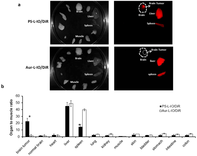 Figure 7: Ex vivo optical imaging of biodistribution of the PS-L-IO/DiR nanoprobe. a. Immediately after in vivo optical imaging at 24 h, the glioma-bearing brain and various organs were dissected and subjected to ex vivo optical imaging. Under the NIR fluorescent light, the brain tumor was distinct from the normal brain in the mouse treated with the PS-L-IO/DiR, while it was not visible with the Aur-L-IO/DiR probe. Significant amounts of light signals were also captured from liver and spleen for each probe. b. Average photon counts for the tumor and each normal tissue were obtained and normalized by the muscle value (TMR), showing that TMR of brain tumors in the PS-L-IO/DiR treated mice was significantly higher than that of the Aur-L-IO/DiR mice (22.8 ± 4.5 vs 1.9 ± 1.2, *p < 0.01). The uptake of PS-L-IO/DiR by liver was slightly lower than that of the Aur-L-IO/DiR (45.3 ± 5.2 vs 48.9 ± 3.8); however, the spleen had significantly lower uptake of PS-L-IO/DiR (TMR = 14.6 ± 3.8 vs 39.8 ± 1.5, *p < 0.01).