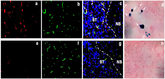 Figure 8: Fluorescence microscopy to detect the localization of PS-L-IO/DiR. Frozen sections of tumor-bearing brain tissues were immunofluorescently examined for the localization of DiR signals (red) of the PS-L-IO/DiR a-c. and the control Aur-L-IO/DiR e-g. probe. Vascular endothelial cells were detected by immunofluorescence staining with anti-CD31 (green). Nuclei were detected with DAPI (blue). The merged image c. clearly showed that PS-L-IO/DiR localized predominantly in brain tumor tissues, with many co-localizing with tumor vascular endothelial cells (yellow, arrows). By contrast, there was much fewer, sparse DiR signals of the Aur-L-IO/DiR in tumor tissues g. Similarly, Prussian blue staining showed more blue-stained iron nanoparticles in the tumor treated with the PS-L-IO/DiR (arrows, d.) than the control Aur-L-IO/DiR h. Note: BT, brain tumor; NB: normal brain; Dotted line: boundary between tumor and normal brain. Magnification 20 X.