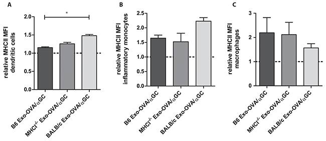 Figure 2: MHC class II upregulation on DC, monocytes and macrophages 1 hour after exosome injection. 100 μg PKH67-labeled exosomes were injected i.v. into the tail vein of C57Bl/6 mice, as a control PKH67 alone was injected. A. MHC class II expression on CD11b- CD11c+ dendritic cells, B. MHC class II expression on CD11bhighCD11c- Ly6ChighLy6G-F4/80+ inflammatory monocytes, C. MHC class II expression on CD11bhighCD11c- Ly6ClowLy6G-F4/80+ macrophages, all data are shown as MFI ratios towards the dye control and as mean ± SEM. Data were analysed by Kruskal-Wallis with Dunn´s multiple comparisons, * P < 0.05.