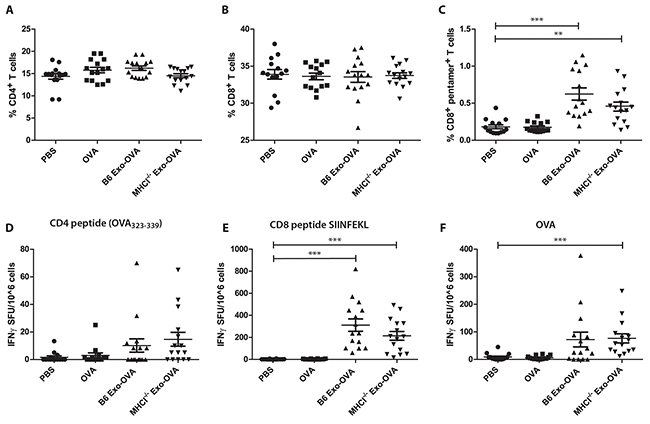 The induction of antigen-specific T cells is a major goal in cancer immunotherapy. However, we have shown the efficacy of protein loaded over peptide-loaded exosomes in vivo. Therefore, we asked whether MHC class I molecules on exosomes are needed for the induction of antigen-specific T cells. We injected 40 μg of B6 Exo-OVA, MHCI-/- Exo-OVA, free OVA (300 ng) or PBS i.v. into C57Bl/6 recipient mice and analysed the immune response 7 days after injection. The percentage of total splenic CD4+ T cells (Figure 3A) and CD8+ T cells (Figure 3B) were equal in all treatment groups. OVA specific CD8+ T cells were significantly increased in B6 Exo-OVA and MHCI-/- Exo-OVA injected groups compared to PBS and soluble OVA with no difference between the exosome injected groups (Figure 3C). In addition, in vitro CFSE proliferation assay with OT-I/Rag2-/- splenocytes (specific transgene that encodes a T cell receptor specific for SIINFEKL peptide) showed similar proliferation after stimulation with B6 Exo-OVA or MHCI-/- Exo-OVA (Supplementary Figure S1). Importantly, free OVA was not immunostimmulatory, demonstrating the adjuvant effect of the exosomes (Figure 3C). After ex vivo restimulation with the CD4-restricted peptide (OVA323-339), no significant differences in IFNγ production between the groups were observed (Figure 3D). In line with the flow cytometry data (Figure 3C), restimulation with SIINFEKL or OVA induced similar levels of IFNγ producing cells in B6 Exo-OVA or MHCI-/- Exo-OVA mice (Figure 3E, F). Taken together, these data support the hypothesis that MHC class I is not needed on the exosomes for inducing an antigen-specific CD8+ T cell response.