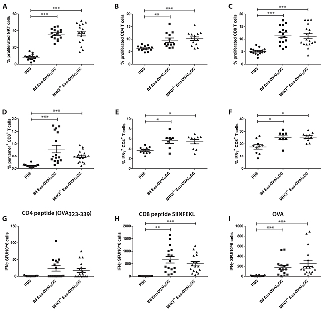Next, we investigated if potentiating the immune system by adding αGC onto exosomes would influence the independence of MHC class I molecules on exosomes. We have previously described that αGC associated with exosomes synergistically stimulates OVA specific CD4+ and CD8+ T cells and reduces tumour growth significantly, compared to only OVA-loaded exosomes [9]. Exosomes from B6 and MHCI-/- BMDCs induced similar levels of NKT cell proliferation (Figure 4A), indicating similar levels of αGC on the two exosome types. No differences between B6 and MHCI-/- exosome induced CD4+ and CD8+ T cell proliferation (Figure 4B,C) and percentages of OVA-specific CD8+ T cells (Figure 4D) were detected. Exosomes did not induce any changes in T follicular helper cells or percentages of marginal zone B cells, however they induced a slight increase in follicular B cells and germinal center B cells, but with no differences between B6 and MHCI-/- exosomes (data not shown). We further restimulated splenocytes with PMA/Ionomycin/Brefeldin A and determined intracellular IFNγ expression. Both exosome types led to a similar increase in IFNγ+CD4+ (Figure 4E) and IFNγ+CD8+ (Figure 4F) T cells. ELISPOT assay showed that restimulation with SIINFEKL peptide (Figure 4H) and whole OVA (Figure 4I) induced comparable numbers of IFNγ expressing cells. No significant effect was observed when splenocytes were restimulated with CD4 peptide (Figure 4G). Importantly, B6 Exo-OVA/αGC and MHCI-/- Exo-OVA/αGC exosomes did not show any differences in their capacity to induce IFNγ.