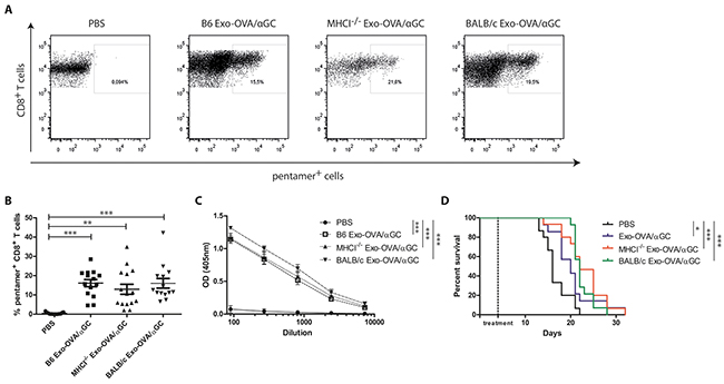 We wanted to investigate if exosomes lacking MHC class I are capable of diminishing tumour growth in a therapeutic tumour model. With the goal to increase feasibility of future cancer treatments in humans, we also tested allogeneic exosomes, i.e. with an MHC mismatch in both MHC class I and II (BALB/c Exo-OVA/αGC). BALB/c exosomes expressed a similar phenotype compared to B6 and MHCI-/- and had similar OVA levels (Supplementary Figure S2A, S2B, S2C). Furthermore, they were able to induce in vitro proliferation of splenocytes from OTI/RAG2-/- in comparable levels to B6 and MHCI-/- exosomes (data not shown). B6 mice were injected s.c. with 200,000 B16/OVA F1 melanoma cells followed by treatment with 40 μg of B6 Exo-OVA/αGC, MHCI-/- Exo-OVA/αGC or BALB/c Exo-OVA/αGC four days after tumour inoculation. Tumour bearing mice showed enhanced tumour-infiltrating T cells and OVA specific T cells (Figure 5A and 5B, Supplementary Figure S3) and increased overall survival (Figure 5D) in all exosome treated groups. No significant difference was observed in tumour-infiltrating T cells between B6 Exo-OVA/αGC, MHCI-/- Exo-OVA/αGC and BALB/c Exo-OVA/αGC treated mice (Figure 5B). This suggests that MHC molecules on exosomes are not needed to trigger anti-tumour immune responses in vivo. Furthermore, serum levels of OVA-specific antibodies were similar in all treatment groups (Figure 5C), which indicates that also the B cell response is independent of MHC on exosomes.