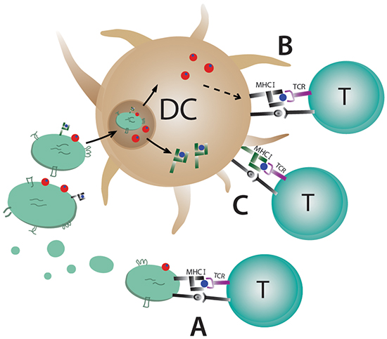 Figure 6: Possible mechanisms for T cell stimulation by antigen-loaded exosomes. Dendritic cell-derived exosomes carry MHC class I and II molecules on the surface and A. can stimulate T cells directly by binding to the T cell receptor. Direct stimulation of T cells requires syngeneic MHC (black) molecules on exosomes due to MHC restriction. B. Uptake of exosomes by antigen presenting cells can lead to their degradation and loading of exosomal peptides on the APC´s MHC molecules or C. the whole exosomal MHC/peptide complex (green) can be recycled and exposed on the cell surface.