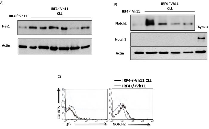 Figure 1: IRF4-/-Vh11 CLL cells display hyperactive Notch signaling and express high levels of Notch2 receptor. A. Western-blot analysis to detect the levels of Hes1 protein in IRF4-/-Vh11 CLL cells compared to IRF4+/+Vh11 B cells isolated from spleen. Each lane represents CLL cells from an IRF4-/-Vh11 mouse. B. Western-blot to detect the levels of Notch2 and Notch1 proteins in IRF4-/-Vh11 CLL cells. Each lane represents an individual CLL sample. Thymus is used as a positive control for Notch1 protein and actin is used as loading control. C. Histograms showing Notch2 cell surface staining in IRF4-/-Vh11 CLL cells compared to IRF4+/+Vh11 B cells as detected by Flow cytometry. Left panel shows isotype control antibody (IgG) staining and right panel shows Notch2 staining. Gray line represents gating on IRF4+/+Vh11 B cells and black line indicates IRF4-/-Vh11 CLL cells. The data shown is representative of at least three independent experiments.