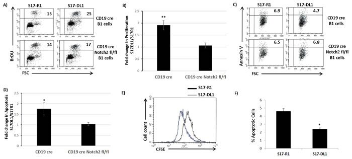 Figure 2: Notch signaling promotes the survival and proliferation of B1 cells and CLL cells. A. Flow cytometry analysis showing the BrDU incorporation assay for cell proliferation of CD19cre control and CD19cre Notch2fl/fl B1 cells co-cultured with S17-R1 and S17-DL1 stromal-cells for 48 hours. The numbers in the upper right quadrant of each dot plot represents the percentage of BrDU positive cells. B. Bar graphs showing the statistical analysis of BrDU incorporation assay from three independent experiments. The data is represented as fold change in proliferation observed on S17-DL1 stromal-cells compared to S17-R1 control stromal-cells. C. Flow cytometry analysis showing Annexin V staining to detect apoptotic cells among CD19cre and CD19cre Notch2fl/fl B1 cells cultured with S17-R1 and S17-DL-1 stromal-cells for 48 hours. The numbers in each dot plot represents the percentage of Annexin V positive cells in the upper right quadrant. D. Bar graph showing the statistical analysis of Annexin V staining of CD19cre and CD19cre Notch2fl/fl B1 cells from five independent experiments. The data is represented as fold change in proliferation observed on S17-DL1 stromal-cells compared to S17-R1 control stromal-cells. E. Histograms representing CFSE dye dilution experiment to measure proliferation of IRF4-/-Vh11 CLL cells co-cultured with S17-R1 (black line) and S17-DL1 (gray line) stromal-cells. Black line represents CLL cells cultured on S17-R1 stromal-cells and gray line represents. F. Bar graphs showing the percentages of Annexin V positive IRF4-/-Vh11 CLL cells co-cultured with S17-R1 and S17-DL1 stromal-cells from three independent experiments. *p value ≤0.01. **p value ≤0.05.