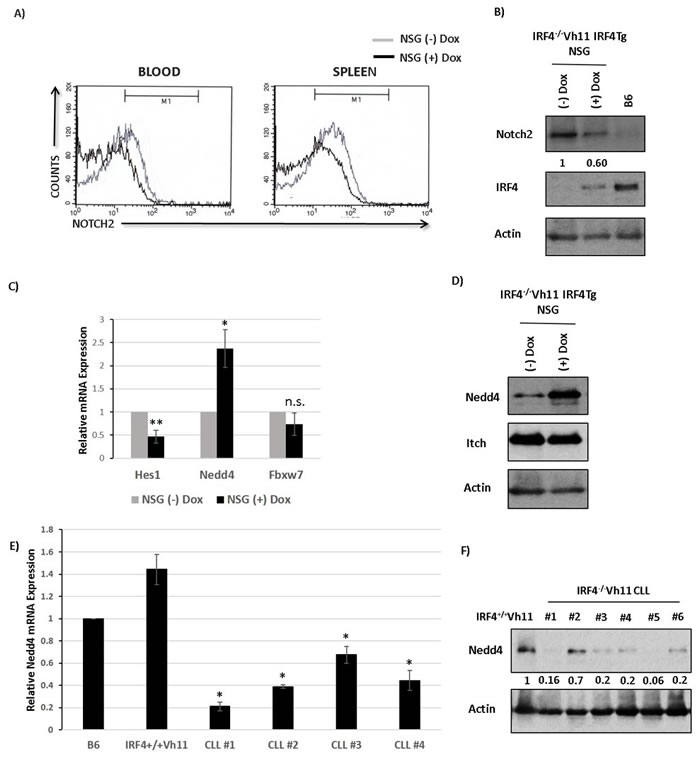 Figure 4: IRF4 regulates E3 ubiquitin ligase Nedd4 in CLL cells. A. Histograms showing Notch2 staining in CLL cells isolated from blood and spleen of NSG mice fed with (black line) or without dox water for 3 weeks (gray line). B. Western-blot analysis to detect Notch and IRF4 levels in CLL cells isolated from NSG mice fed with or without dox water for 3 weeks. The numbers below represents normalized relative expression. B cells isolated from B6 mice are used as a measure of endogenous levels of IRF4. Actin is used as loading control. C. Bar graph representing the relative mRNA expression of Hes1, Nedd4 and Fbxw7 in CLL cells isolated from NSG mice fed with or without dox water for 3 weeks. D. Western-blot analysis to measure Nedd4 and Itch protein levels in NSG mice fed with or without dox. E. Bar graph showing the relative mRNA expression of Nedd4 in four different IRF4-/-Vh11 CLL samples compared to B cells isolated from wildtype B6 and IRF4+/+Vh11 mice. F. Western-blot analysis to measure the levels of Nedd4 protein in IRF4-/-Vh11 CLL samples compared to IRF4+/+Vh11 B cells. The numbers at the bottom represents Nedd4 expression measured by densitometric analysis using ImageJ software. Actin is used as the loading control. *p value ≤0.01 **p value ≤0.05.