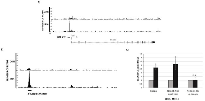 We performed Chromatin Immunoprecipitation sequencing (ChIP-seq) to identify genome wide binding sites for IRF4 in B1 cells. For this study, IRF4+/+Vh11 B1 cells were used to map IRF4 binding sites and IRF4-/-Vh11 B1 cells were used as control cells. Strikingly, ChIP-seq revealed a robust binding of IRF4 in the promoter region of nedd4 gene (Figure 5A). Furthermore, the IRF4 binding peak was mapped to a region harboring a canonical Interferon-Stimulated Response Element (ISRE) DNA motif (Figure 5A). The ISRE element was present 2 kilobases (kb) upstream to the transcription start site (TSS) in the nedd4 gene promoter (Figure 5A). IRF4 has been previously shown to bind 3’ enhancer in the kappa immunoglobulin light chain locus [26]. Our ChIP-seq screen also showed a strong binding peak for IRF4 in the 3’ kappa enhancer region, ascertaining the specificity of our assay (Figure 5B). The IRF4 binding to the ISRE motif in the nedd4 gene locus was further confirmed by the conventional ChIP assay, which showed significant enrichment of IRF4 binding at nedd4 gene promoter in IRF4+/+Vh11 B1 cells (Figure 5C). Notably, we did not observe IRF4 binding at a region 4kb upstream to the TSS (Figure 5C). In summary, our results indicate that Nedd4 is a direct target of IRF4 in B1 cells.