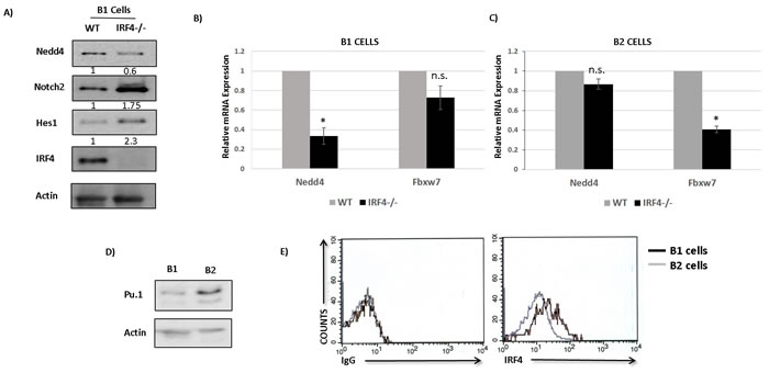 Figure 6: IRF4 regulates Nedd4 expression in B1 but not B2 cells. A. Western-blot showing the levels of Nedd4, Notch2, Hes1 and IRF4 in IRF4-/- B1 cells compared to IRF4+/+ B1 cells. The numbers below represent normalized relative expression calculated by densitometric quantification of respective proteins. B. Bar graph showing the relative mRNA expression of Nedd4 and Fbxw7 in IRF4-/- and IRF4+/+ B1 cells. C. Bar graph showing the relative mRNA expression of Nedd4 and Fbxw7 in IRF4-/- and IRF4+/+ B2 cells. D. Western-blot analysis to detect the levels of Pu.1 in B1 cells isolated from PC and B2 cells isolated from spleen of wild type mice. E. Flow cytometry analysis using intracellular staining to measure the levels of IRF4 in PC B1 cells and splenic B2 cells. The histograms represents intracellular staining with isotype control antibody (left panel) and with IRF4 antibody (right panel). Gray line represents B2 cells and Black line represents B1 cells. Cells were gated specifically on B1 and B2 populations based on IgM and B220 staining. *p value ≤0.01.