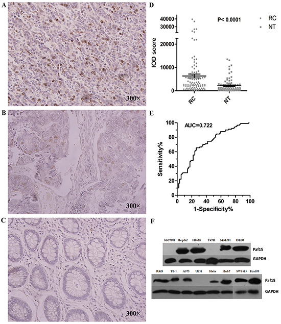 Figure 1: Expression of Paf15 in RC. A. Strong positive image in RC. Staining is indicated by brown color in nuclei. B. Modest positive image: several cells showed less intense nuclear staining. C. Negative Paf15 expression. D. Paf15 expression levels in paired normal colorectal cancer and adjacent normal tissue (n = 105) as shown normalized by IOD score. E. ROC curve analysis for Paf15 expression. The area under the curve (AUC) was 0.722; F. Paf15 expression levels in multiple cancer cell lines.