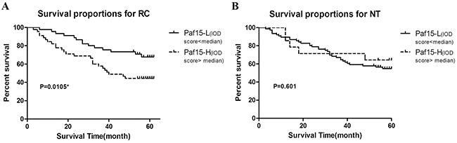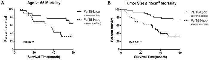 Tissue specimens were embedded in paraffin and cut into serial 4-mm sections. Slides were immersed in 1 mmol EDTA (pH 9.0) and boiled for 15 min in a microwave oven. Endogenous peroxidase activity was blocked by incubation in 0.3% H2O2 in methanol for 15 min. Specimens were incubated with a primary antibody specific to Paf15 (AT2611a, 1:500 dilution; Abgent, San Diego, USA) at 4°C overnight. Then they were incubated with a secondary antibody (Goat Anti-Mouse IgG, 1:500 dilution; Pierce Biotechnology, Inc., Rockford, IL, USA) for 60 min at room temperature in a moist chamber. Slides were stained using diaminobenzidine tetrahydrochloride (DAB) and counterstained with hematoxylin. Next, they were dehydrated and slip-covered. Images of stained sections were obtained using an optical microscope (BX51; Olympus, Tokyo, Japan) equipped with a digital camera (PD71; Olympus). Paf15 was scored using Image Pro-Plus 6.0 [3 parameters: density mean, area sum, and integrated optical density (IOD)] [33], and results were confirmed by visual assessment. According to these IOD scores, Paf15 expression was divided into two groups: Paf15-Low (IOD score < median score); and Paf15-High (IOD score ≥ median score). All slides were independently assessed by two investigators (Dr. Kun Zhu and Rong Yan) to eliminate the scoring error. An agreement was reached after careful discussion.