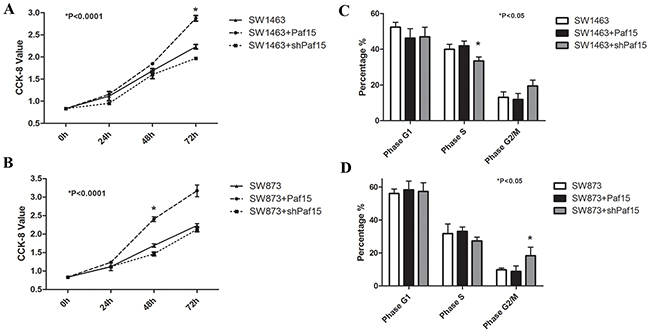 Figure 4: Paf15 expression influences on RC cell viability & cell cycle. Cell viability was detected at 0, 24, 48 and 72 hours after transfection using a CCK-8 assay. There were statistically significant differences (P<0.001) in SW1463 at 72 hours A. and in SW837 at 48 hours B. among the 3 groups. Cell cycles were tested at 48 hours after transfection; SW1463 showed a statistically significant difference (P<0.05) in S phase among the 3 groups C. while SW837 showed a statistically significant difference (P<0.05) in G2/M phase among the 3 groups D.