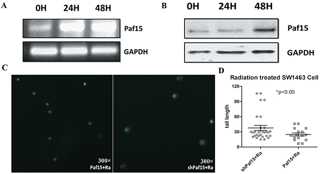 Figure 5: Paf15 expression after radiation and its effect on DNA damage. A. Paf15 expression at 0, 24 and 48 hours after radiation was measured using RT-PCR (A) and Western blot B. with GAPDH expression as a control. C. DNA damage at 48 hours after radiation was compared for different Paf15 expression levels by comet assay. D. DNA damage measured by comet tail length of each measured cell. Increased Paf15 expression resulted in a reduction of DNA damage after radiation (P<0.05).