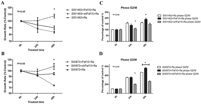Figure 6: Effects of Paf15 expression on cell viability & cell cycle after radiation. RC cells with varying Paf15 expression levels were treated with gamma irradiation or plated without radiation as a control, then subjected to CCK-8 assay & flow cytometry at 0, 24 and 48 hours. A. & B. Growth rate, expressed as CCK-8 value percentages of unirradiated controls, showed a significant difference in cell proliferation at 48 h after radiation (P<0.05). C. Decreased Paf15 expression alleviated radiation-induced G2/M phase arrest in SW1463 at 24 hours after radiation (P<0.05) and D. in SW873 at both 24 and 48 hours after radiation (P<0.05). Vertical axis represents G2/M phase cell percentages of unirradiated controls.