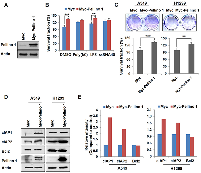 Figure 1: Overexpression of Pellino-1 increases the survival of lung cancer cells. A and B. A549 cells were transfected with Myc or Myc-tagged Pellino-1 (Myc-Pellino-1) expression plasmids, then subjected to immunoblotting with anti-Pellino-1 and anti-actin antibodies (A). Pellino-1-overexpressing A549 cells were unstimulated (DMSO) or stimulated with Poly (I:C), LPS, or ssRNA40. At 7 days after stimulation, cells were incubated with crystal violet coloration, and the intensity of crystal violet was determined by spectrometry at 570 nm. The percentage of surviving fractions was determined by the intensity of crystal violet relative to Myc-transfected and DMSO-treated cells (B). C. A549 and H1299 cells were transfected with Myc or Myc-Pellino-1. At 7 days after transfection, cells were incubated with crystal violet coloration, and the intensity of crystal violet was determined. The percentage of surviving fractions was determined by the intensity of crystal violet relative to Myc-transfected cells. D and E. Cell lysates of Pellino-1-overexpressing A549 and H1299 cells were analyzed by immunoblotting with anti-cIAP1, anti-cIAP2, anti-Bcl2, anti-Pellino-1, and anti-actin antibodies (D). The expression of the indicated proteins was quantified using densitometry. Histograms represent the intensity of protein normalized to actin (E). The results are representative of three independent experiments. All P values were calculated using unpaired Student’s t test. **P < 0.01; ***P < 0.005.