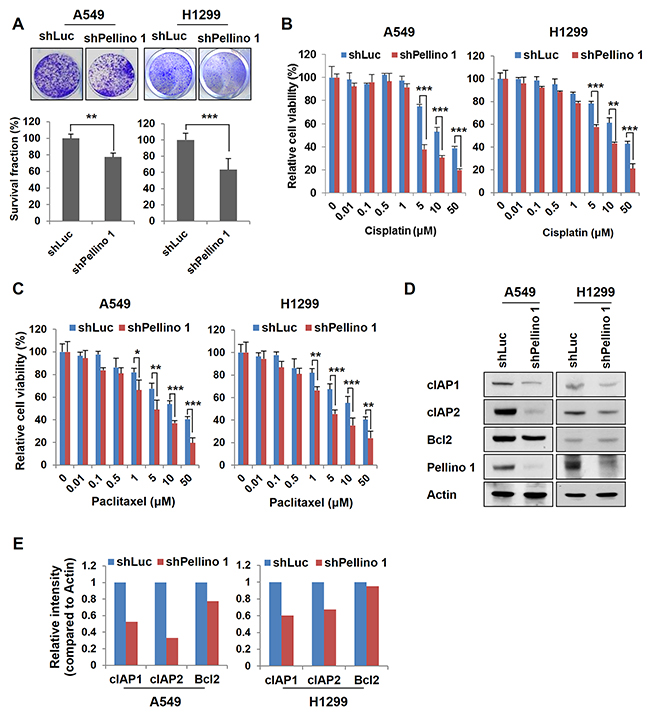 Furthermore, knockdown of Pellino-1 using shPellino-1 in A549 and H1299 cells reduced the cell survival compared with control cells (Figure 3A) and sensitized these cells to cisplatin or paclitaxel (Figure 3B and 3C). Of note, Pellino-1-knockdown reduced cIAP1 and cIAP2 expression (Figure 3D and 3E).