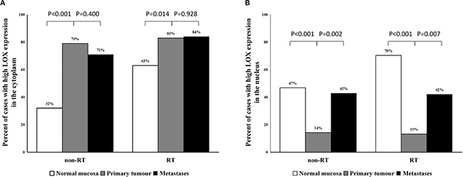 Figure 2: The frequency of high cytoplasmic and nuclear expression of LOX protein. (A) The percentage of high cytoplasmic LOX expression significantly increased from normal mucosa to primary tumour. (B) The LOX expression in the nucleus was significantly decreased in the primary tumour compared with normal mucosa and increased from primary tumour to lymph node metastases.