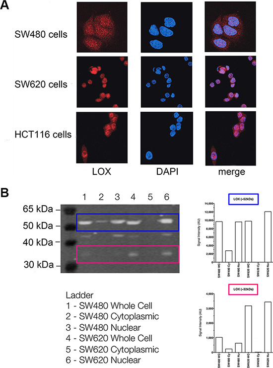 Figure 3: The subcellular localisation of LOX protein in colon cancer cell lines. (A) Immunofluorescence of LOX expression determined by confocal microscopy in SW480, SW620 and HCT 116 cells. (B) Western blot analysis of LOX expression in cytoplasmic and nuclear fractions from SW480 and SW620 cells.