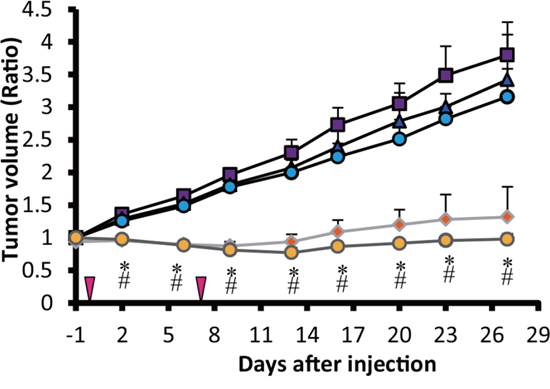 Figure 1: Radioimmunotherapy effects on BxPC-3 xenografts. Tumor volume change expressed as the ratio of the volume at the indicated day/volume 1 day before the start of the treatment. Tumors in mice treated with a single administration (3.7MBq) (orange diamonds) and double administration (3.7MBq x 2) (yellow circles) of 90Y-ITGA6B4, showed significantly reduced growth rates compared with the untreated control (purple squares), unlabeled single dose of ITGA6B4 treated (blue triangles) and double administration of unlabeled ITGA6B4 treated (light blue circles) groups. Values shown represent mean ± SD, *P < 0.04 (single 90Y-ITGA6B4 vs others), #P < 0.04 (double 90Y-ITGA6B4 vs others), n=7, except in a group that received double administration of 90Y-ITGA6B4, numbering 6 mice from the 22nd day onward. Vertical arrowheads indicate the day of administration.