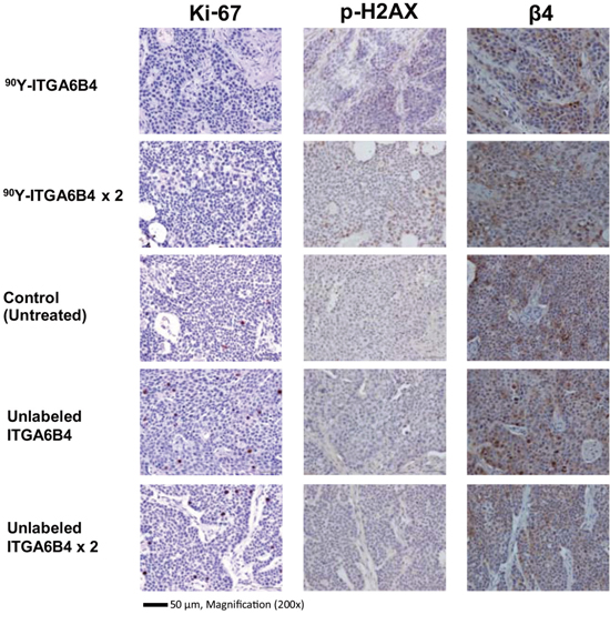 Figure 2: Ki-67, p-H2AX immunostaining of tumor sections 2 days after radioimmunotherapy. A reduction in Ki-67-positive cell numbers and an increased p-H2AX-positive cell numbers were observed in mouse samples treated with single (3.7MBq) or double administrations (3.7MBq x 2) of 90Y-ITGA6B4, compared with untreated and matched control samples. Similar integrin β4 expression pattern was seen in all tumor samples. Tumor section photos were taken under 200× magnification (scale bar, 50 μm).