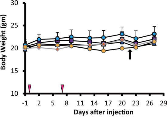 Figure 3: Comparison of the body weights of tumor-bearing nude mice. The average mouse body weight did not differ significantly among all 5 groups. One mouse in the double administration of 90Y-ITGA6B4 (3.7MBq x 2) group died after 22 days (indicated with black arrow). 90Y-ITGA6B4 single (3.7MBq) (orange diamond) and double administration (3.7MBq x 2) (yellow circles), untreated control (purple squares), unlabeled ITGA6B4 single administration (blue triangles) and unlabeled ITGA6B4 double administration (light blue circles) groups are presented. Values shown represent mean ± SD, n=7, except in the double administration of 90Y-ITGA6B4 group, which numbered 6 mice from the 22nd day onward. Vertical arrowheads indicate the day of administration.