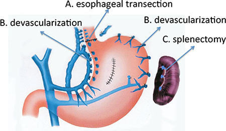 The operation indications include: failure of medical treatment, endoscopic therapy is invalid, repeated hemorrhage, hypersplenism, and the patient’s liver function should be Child-Turcotte-Pugh A or B.