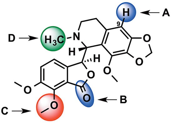 Figure 1: Structural modification of noscapine. A. and B. represent sites of modification of the first generation noscapinoids. Second and third generation noscapinoids were generated by modifications at sites C. and D. respectively.