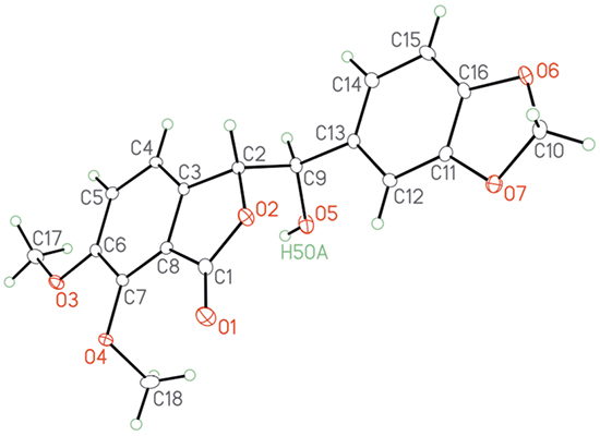 Our synthesis (Scheme 1) began with the commercially available isovanillin 1. Regioselective bromination of 1 gave the 2-bromoisovanillin 2 [25] in 83% yield. This was followed by methylation of the phenolic hydroxyl group in 2 to give the 2-bromo-3,4-dimethoxybenzaldehyde 3 [26] in 76% yield. The phosphonium salt 5 was synthesized from the piperonyl alcohol 4 according to the literature procedure [27] in 93% overall yield. Compounds 3 and 5 were then coupled under Wittig reaction conditions to give inseparable E/Z olefin mixture, which was then treated with CuCN to afford a separable mixture of 6a/6b in 80% global yield with 60:40 ratio in favor of 6a [28]. The Z-isomer 6a was converted to the desired E-isomer using a palladium catalyzed isomerisation process [29]. Compound 6b was then converted exclusively to the enantiomerically pure (>99% ee) phthalide 7 via Sharpless asymmetric dihydroxylation using AD mix-β followed by in-situ cyclization with the cyano group [28]. We were also able to obtain an X-ray crystal structure1 for 7 (Figure 2). Conversion of 7 to the target molecule 9 via a sequence of tosylation, azide displacement and reduction failed, and only the undesired compound 8 was isolated in 65% yield. It is worth mentioning that treatment of 7 with triflic anhydride in pyridine or diphenyl phospheryl azide (DPPA) led to the formation of 8 in comparable yield.
