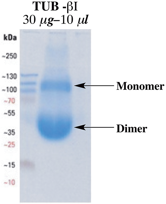 Figure 4: Native gel electrophoresis for the purified recombinant βI-tubulin at neutral pH using non-reducing loading buffer.