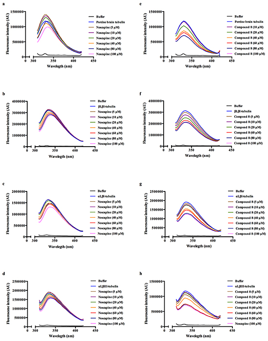 Figure 5: Fluoresence intensity quenching of noscapine a–d. and compound 8 e–h. using porcine brain tubulin (a,e), βI,βI-tubulin (b,f), αI,βI-tubulin (c,g) and αI,βIII-tubulin (d,h).