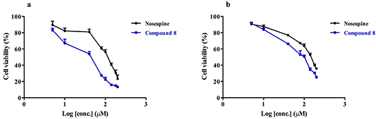 Figure 6: The effect of noscapine and compound 8 on the viability of breast cancer cell line a. SKBR-3; and b. paclitaxel resistant SKBR-3 using an MTT assay. Statistical analysis showed a statistically significant difference in the cytotoxicity of the compounds on both cell lines (p value < 0.05).