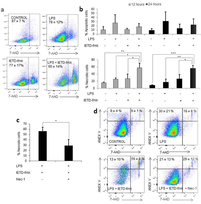 Figure 2: Caspase 8 inhibition induces necroptosis. Primary human monocytes were treated with LPS (1 µg/ml) in the presence or absence of 20 µM of IETD-fmk and/or of 25 µM Necrostatin-1. a. Dot plot showing viability in each condition. b. Percentage of apoptotic (Annexin V+/7-AAD-) cells and necrotic (7-AAD+) cells at 12 and 24 hours post-treatment. c. Variation of the percentage of necrotic cells in the presence or absence of Nec-1. d. Dot plot showing viable, necrotic and apoptotic cells in each condition. Error bars represent standard deviation of the three experiments conducted. Statistical significance was assessed by Bonferroni test.