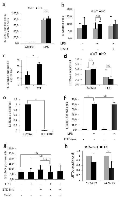 Figure 4: Caspase-8 alone does not regulate murine monocyte activation. Figure a.-d. Primary monocytes from wild-type and knock-out mice were plated either alone or in the presence of 1 µg/mL LPS and/or 25 µM Necrostatin-1 for 24 hours. a) Percentage of activated (CD80 positive) monocytes. b) Percentage of necrotic (7-AAD positive) cells. c) Percentage of cleaved caspase 8 expression by flow cytometry. d) Differences in LETDase activity between wild-type and knock-out monocytes. Figure e.-h. Primary monocytes from wild-type mice were plated either alone or in the presence of 1 µg/mL LPS in the presence or absence of 20 µM IETD-fmk and/or 25 µM Necrostatin-1 for 24 hours e) LETDase activity inhibition induced by IETD-fmk. f) Percentage of activated (CD80 positive) monocytes g) Percentage of necrotic (7-AAD positive) cells. h) LETDase activity normalized against the number of cells . Error bars represent standard deviation of the three experiments conducted. Statistical significance was assessed by Bonferroni test in a, b, d, f and g and Student’s t test in c, e and h.