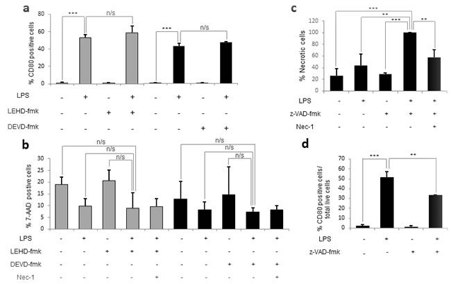 Figure 5: The pan-caspase inhibitor z-VAD-fmk reproduces the effects of caspase 8 inhibition in humans. Murine bone-marrow monocytes were plated either alone or in the presence of 1 µg/mL of LPS and/or 20 µM of DEVD-fmk, LEHD-fmk or z-VAD-fmk and/or 25 µM Nec-1. a. Percentage of activated cells (CD80 positive) in the presence of DEVD-fmk and LEHD-fmk. b. Percentage of necrotic cells (7-AAD positive) in the presence of DEVD-fmk and LEHD-fmk. c. Percentage of necrotic cells in the presence of z-VAD-fmk. d. Percentage of activated cells in the presence of z-VAD-fmk. Error bars represent standard deviation of the three experiments conducted. Statistical significance was assessed by Bonferroni test.