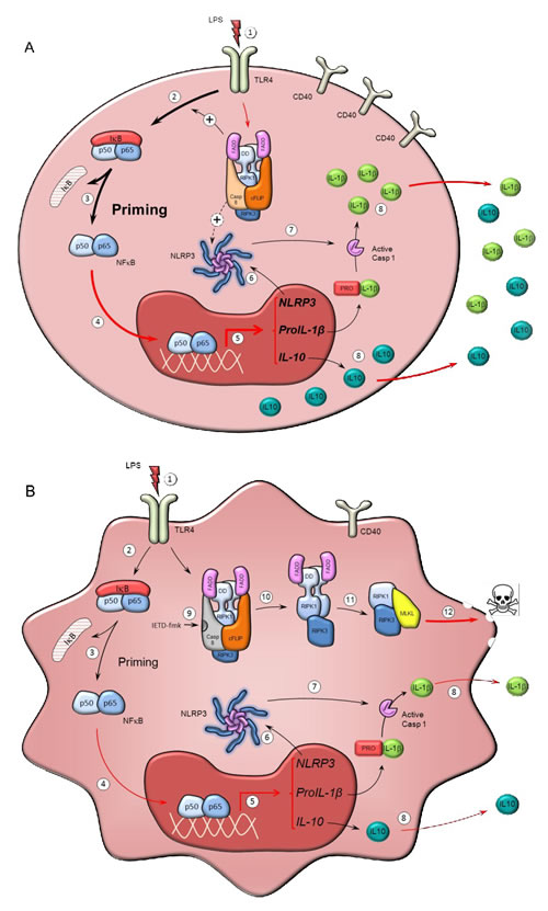 Figure 6 illustrates a proposed mechanism based on our observations alongside well-established concepts in the literature. In human primary monocytes, the activation of TLR receptors leads to the expression of NF-kB-responsive genes such as IL-1β and IL-10. Our data suggests that the activation of caspase-8 alongside ripoptosome assembly takes place in response to TLR4 activation. Furthermore, it highlights the possibility that caspase-8 might have a role in the priming and activation of monocytes. The data shown here contributes to a growing body of literature about the importance of caspase-8 in the pro-inflammatory activation of microglia [21, 22], macrophages [52] and now monocytes. We propose that under caspase-8 inhibition, two events take place: i) necroptotic death of active monocytes, ii) a significant reduction in the release of interleukins involved in SIRS like IL-1β and IL-10. Furthermore, as stated above, given the essential role of the NLRP3 inflammasome in pro-IL1β processing and subsequent release, we anticipate an important role of caspase-8 in NLRP3 assembly within activated monocytes.