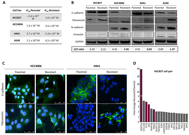 Figure 1: Resistance to erlotinib in NSCLC cells is associated with EMT. A. Calculated IC50 values for parental and erlotinib-resistant tumor cell lines. B. Western blot analysis of protein lysates from indicated tumor cell pairs. Indicated below is the ratio of vimentin to E-cadherin (V/E) for each cell line (normalized to GAPDH). C. Representative images of HCC4006 and H441 parental vs. erlotinib-resistant cells assayed by immunofluorescence analysis of epithelial E-cadherin and mesenchymal fibronectin (green signal) in tumor cell pairs. Blue signal corresponds to DAPI stained nuclei. D. Fold change expression of EMT-related genes in resistant vs. parental HCC827 cells determined by real time PCR expression.