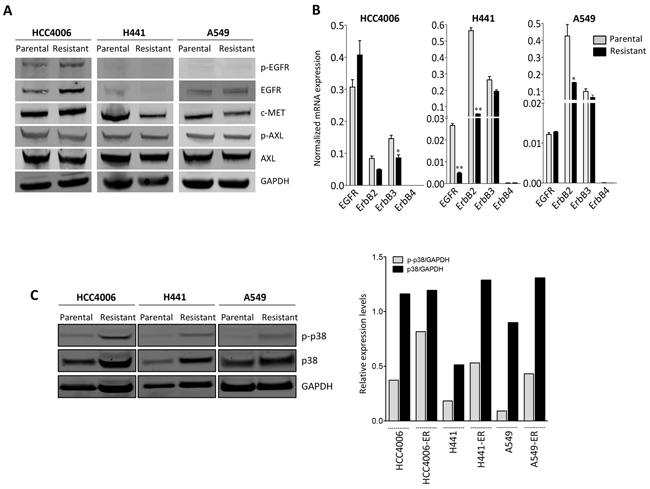 To investigate the potential mechanism(s) involved in erlotinib resistance in our experimental model systems, expression of various kinases previously known to mediate tumor refractoriness to EGFR inhibition was evaluated. As shown in Figure 2A and 2B, EGFR protein and mRNA levels were slightly increased, decreased or remained unchanged in the erlotinib-resistant lines derived from HCC4006, H441, and A549 cells, respectively, compared to their corresponding parental cells. In addition to EGFR, the levels of mRNA encoding for the other members of the ErbB family, including ErbB2 and ErbB3, showed a decrease rather than an increase in all resistant tumor cell lines (Figure 2B). Amplification of the c-MET proto-oncogene has been previously linked to acquired resistance to EGFR kinase inhibitors [26]. In this study, c-MET expression levels were reduced (~50%) rather than increased in the H441 and A549 resistant vs. control cells (Figure 2A). No changes were detected in the expression or phosphorylation of AXL (Figure 2A), a kinase recently shown to be associated with erlotinib-resistance and acquisition of mesenchymal-like features in NSCLC [15].